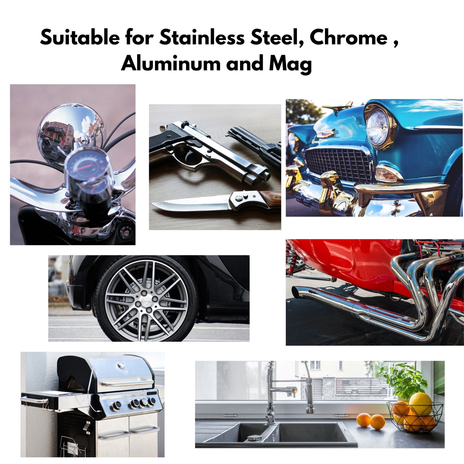 Hard metal kit for automotive and stainless surfaces: Comes with Black, Grey, and White compounds to cut through oxidation, remove fine scratches, and bring out a smooth mirror polish on steel, aluminum, or chrome.