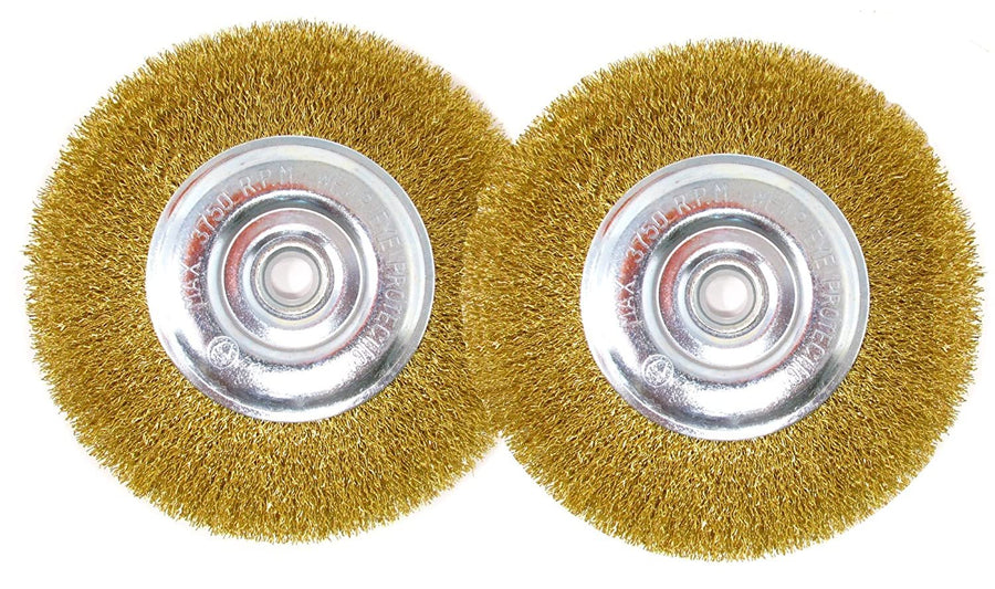 • Pack of two 6 inch brass coated crimped wire wheel for bench grinders